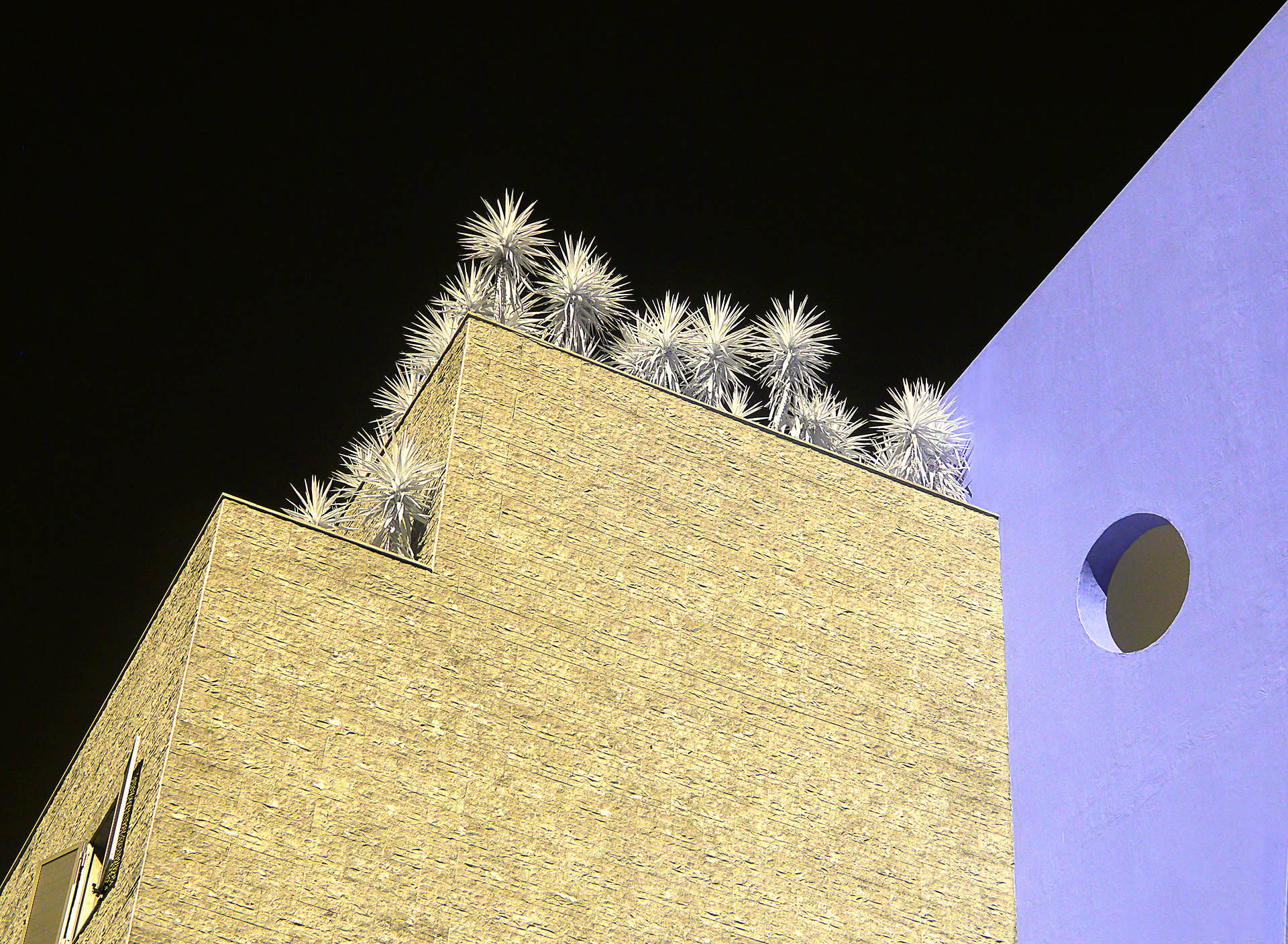 The unexpected location of this garden, the modern forms of the building and the intense blue sky presented the ideal opportunity to use an infrared camera. The green Yucca have been turned white, whilst the clear blue sky is turned to pure black for a striking geometric finish.