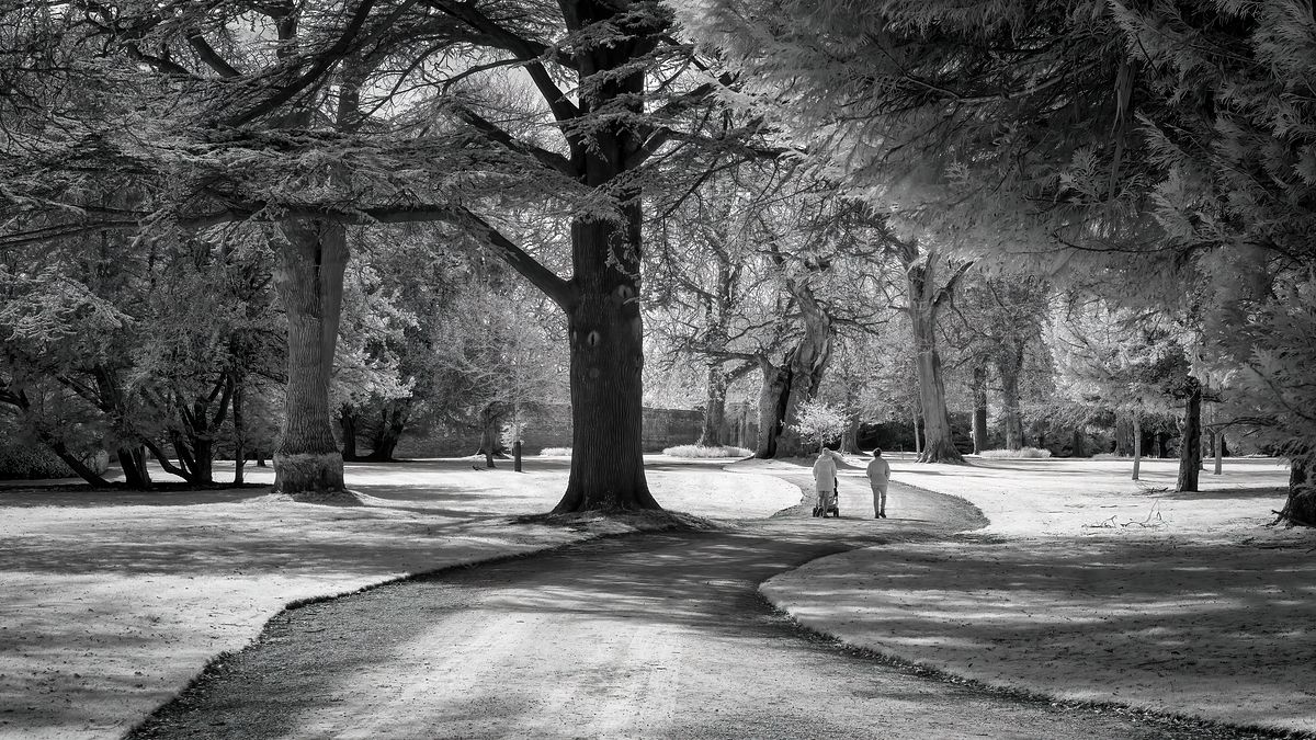 An infrared shot of visitors enjoying a stroll in the spring sunshine in the grounds, heading towards The Walled Garden.