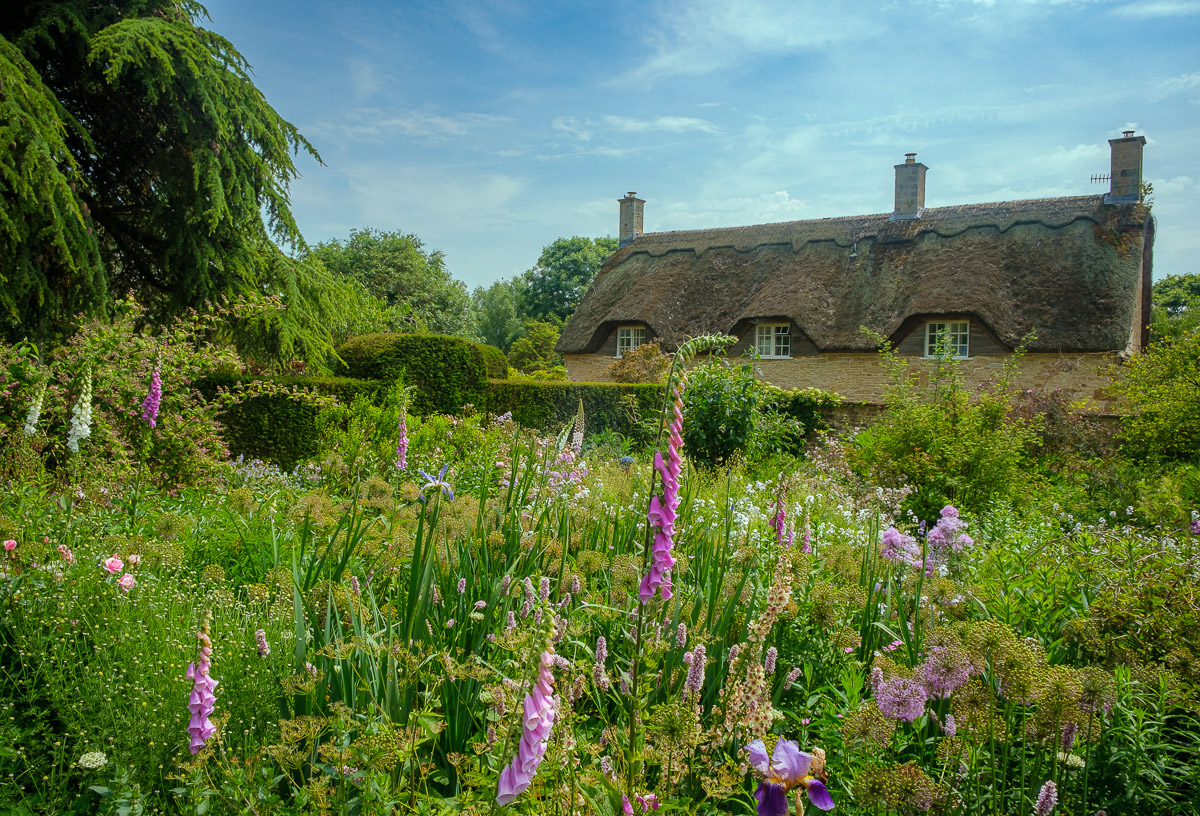 A charming scene at Hidcote, showing one of the quaint thatched cottages with an array of herbaceous perennials, including Digitalis, Allium and Iris species, under a midsummer’s sky.
