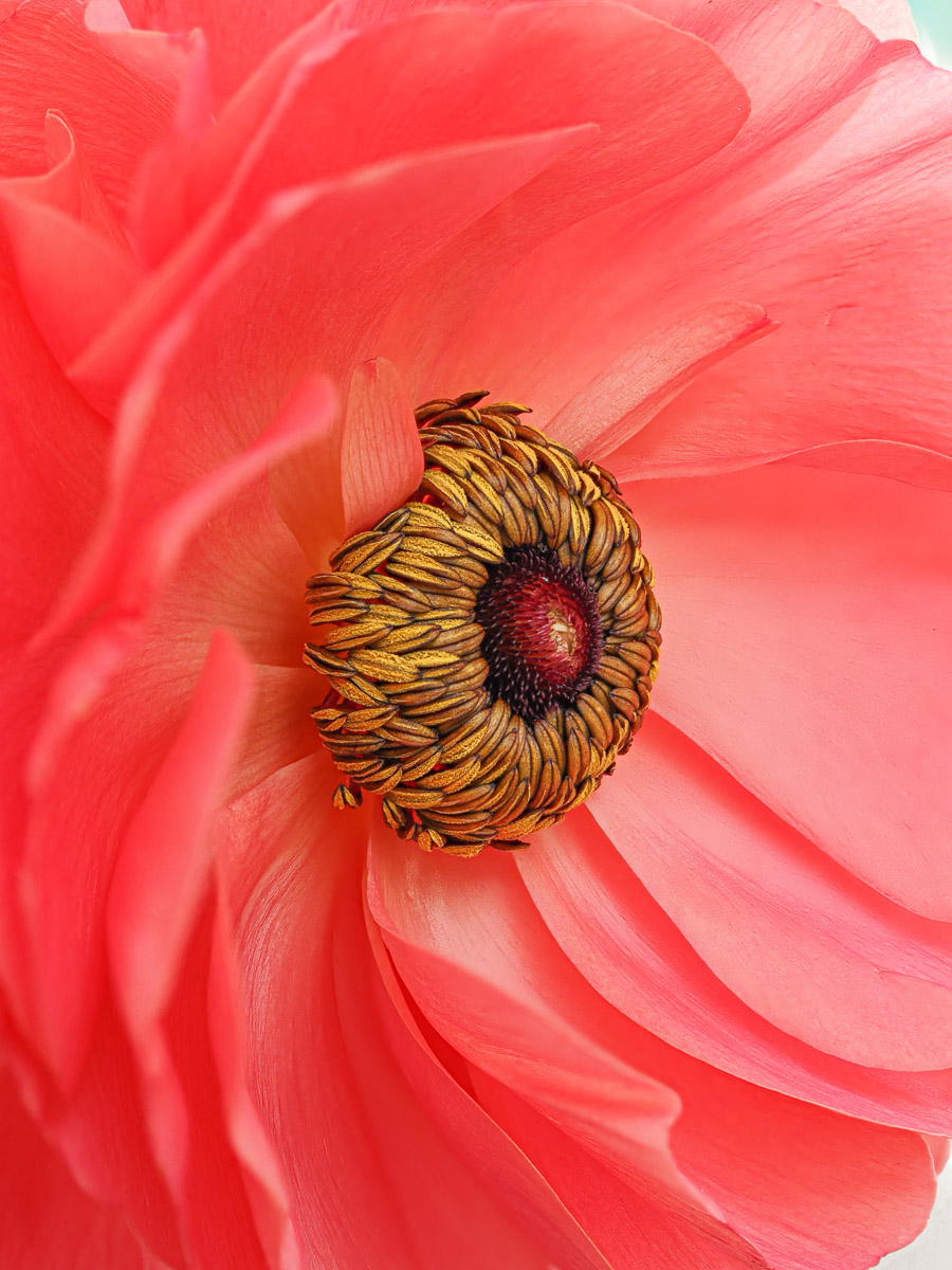 I was attracted to the deep colour of this anemone, and when it opened – the pristine, contrasting, tightly packed golden stamen were revealed. This image is made up of eight separate images, focus stacked in-camera. My objective in focus stacking was to get the whole of the centre sharp, whilst keeping the surrounding petals looking slightly soft.