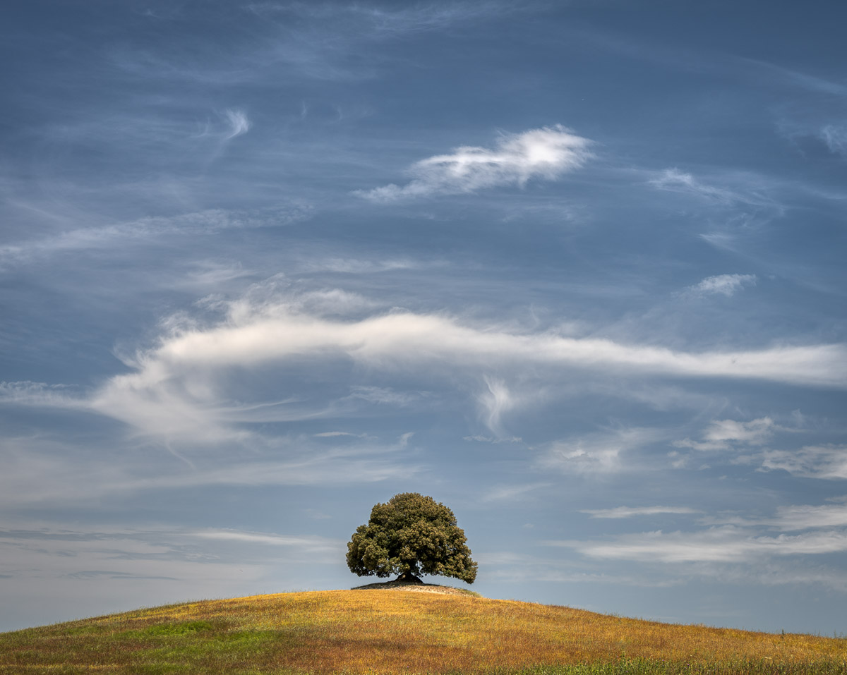 A single tree on top of a Tuscan hill exhibited almost perfect symmetry; the lack of distracting hanging branches adds to the appeal. I placed the tree in the lower part of the frame, in order to emphasise the feeling of isolation.