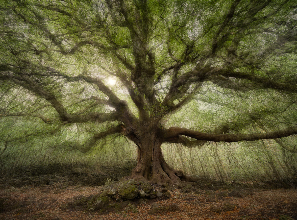 The ‘Ilice di Carrinu’ is a venerable holm oak tree aged over seven hundred years old, that rises in a forest on the slopes of the Etna volcano in Sicily. A survivor of the ages, it is a huge and suggestive tree that transmits us greatness and peace. I created this image with a manual multiple exposure technique, moving myself around the tree and then combining the photos in post-processing.