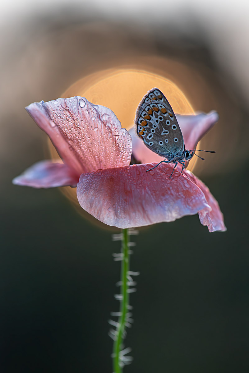 A common blue butterfly at sunrise. I achieved the sunrise effect behind the poppy by photographing the butterfly against the backdrop of the sun rising behind the trees.