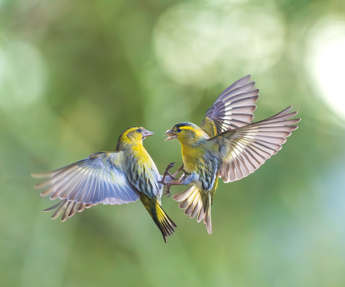 After ten years of photographing birds in our garden, I finally got two male siskins in a mid-aerial battle, claws out and the wonder of nature!