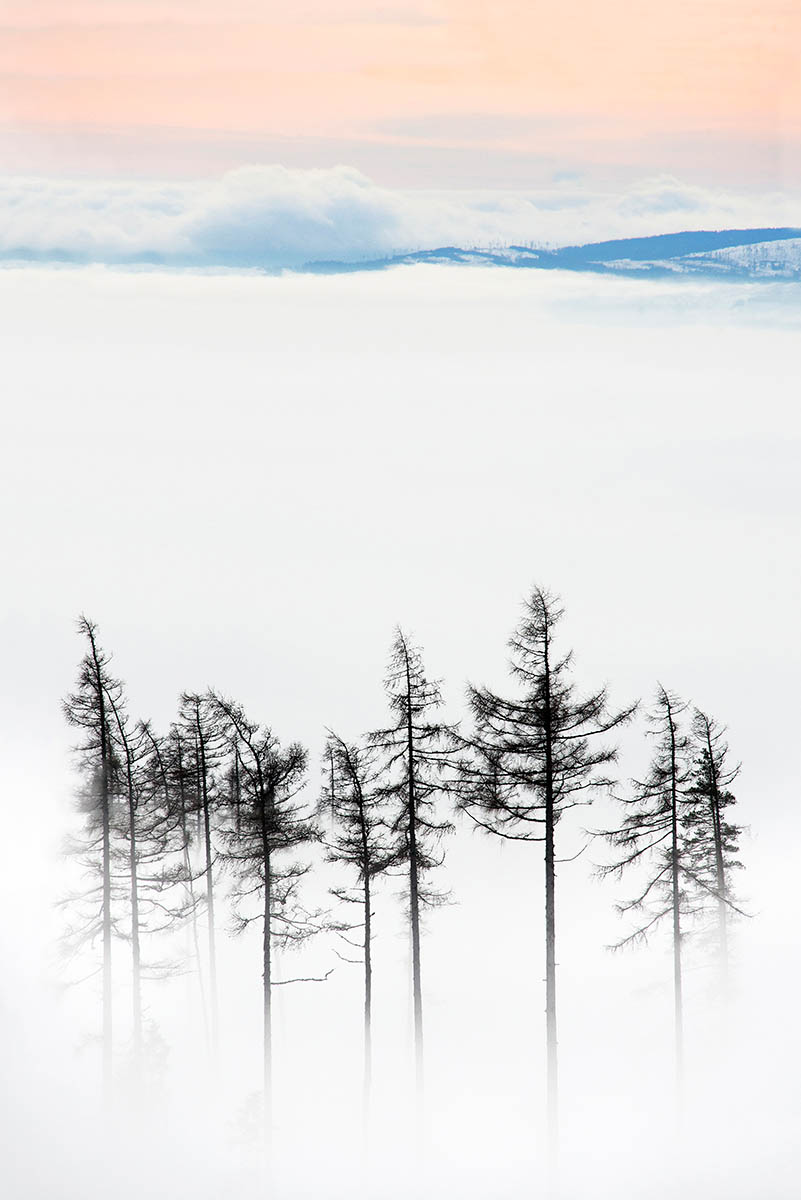 At the time of my visit, the weather conditions were very atmospheric. There wasn't as much snow as I expected, but the cold mist turned the area into an enchanted forest. The image shows a remainder of a spruce forest, most of which was destroyed or damaged by a natural disaster in 2004 in which a hurricane swept away one third of the forest covering the lower slopes of the mountains. Mist, fog and cloud inversion created an eerie atmosphere all around. I spent a week discovering this beautiful area and came across this view on one of many walks, when all the right conditions came together and created this amazing atmosphere.