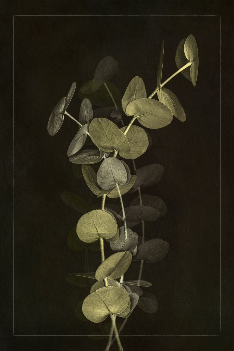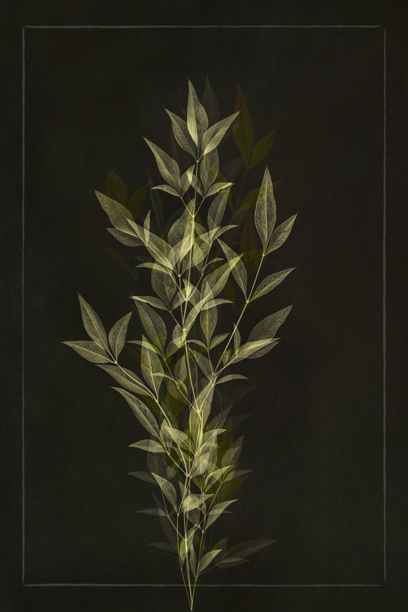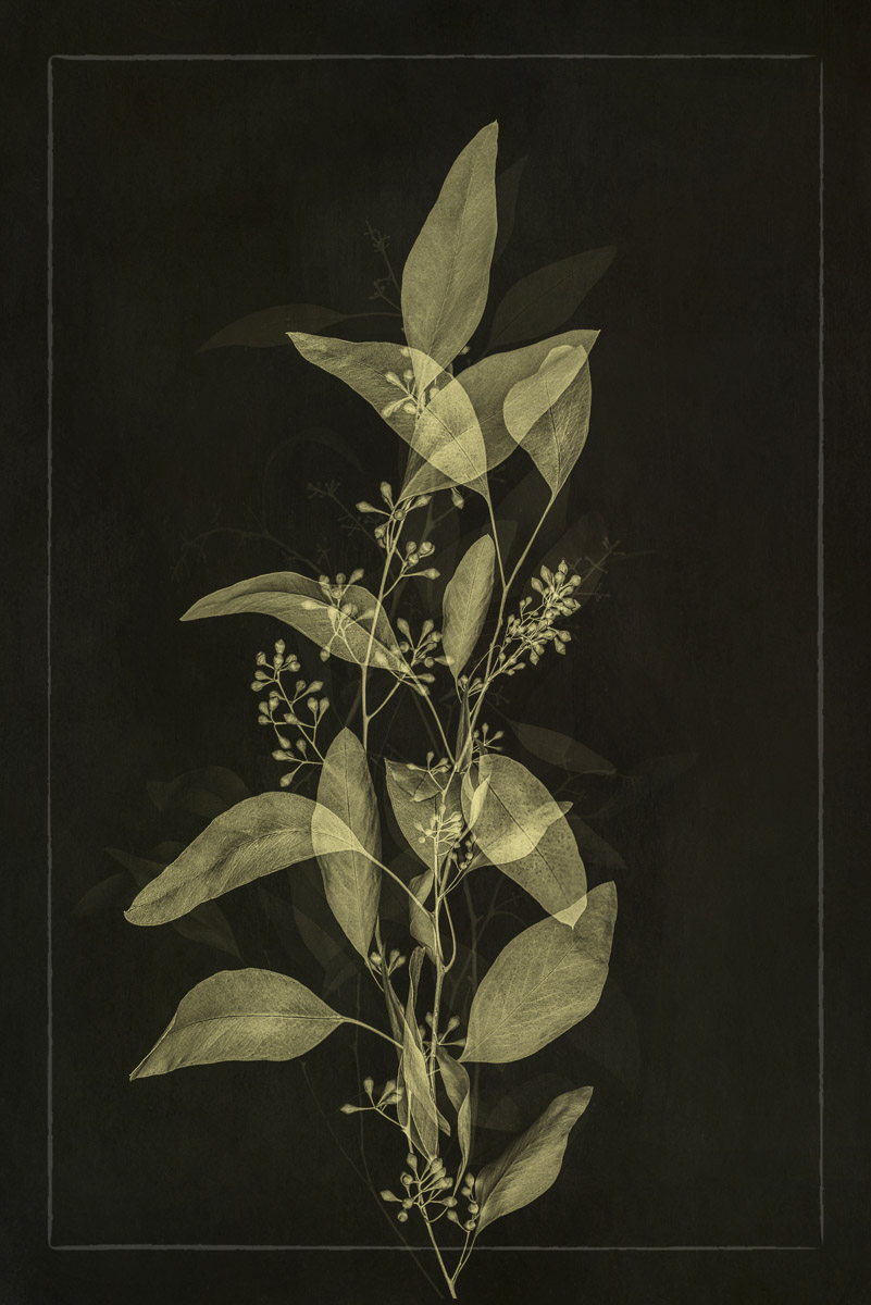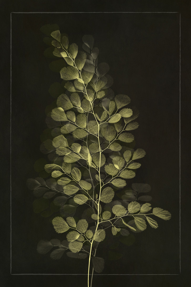 I photographed all of the plant elements on a lightbox. In post-processing, I combined multiple images on different layers using various blend modes and opacities. Other images were made into brushes that I stamped onto a layer, and I again used various blend modes and opacities. Working with a dark background was a departure for me, and I loved the drama it provided.
