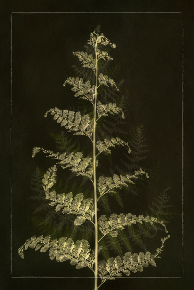 My love of photographing ferns and leaves led me to create this series. I chose to layer images and stamps from Photoshop brushes I made – to give the images depth and interest.